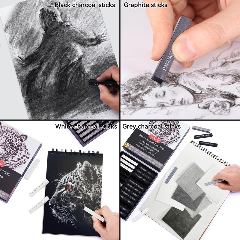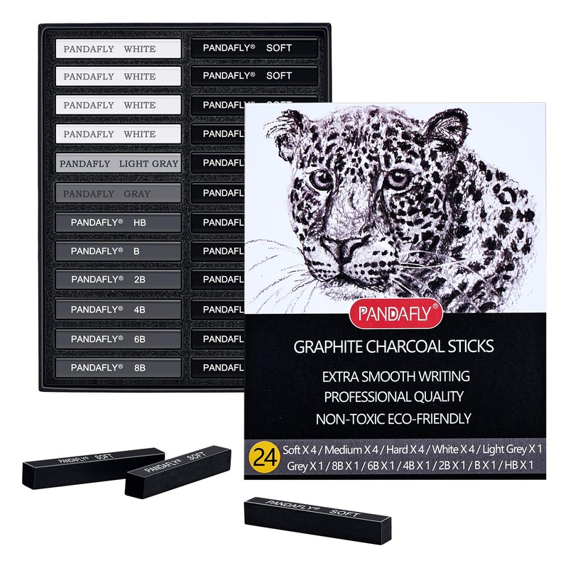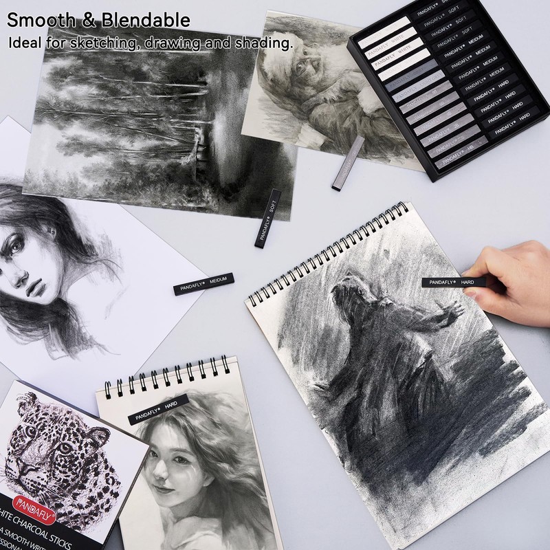 - Diverse Charcoal Hardness - Our 24pcs charcoal sticks set includes 6 pcs graphite sticks(8B 6B 4B 2B B HB), 18pcs charcoal sticks(4 soft 4 medium 4 hard 4 white 1 light grey 1 grey). Different hardness can better meet the needs of your paintings.