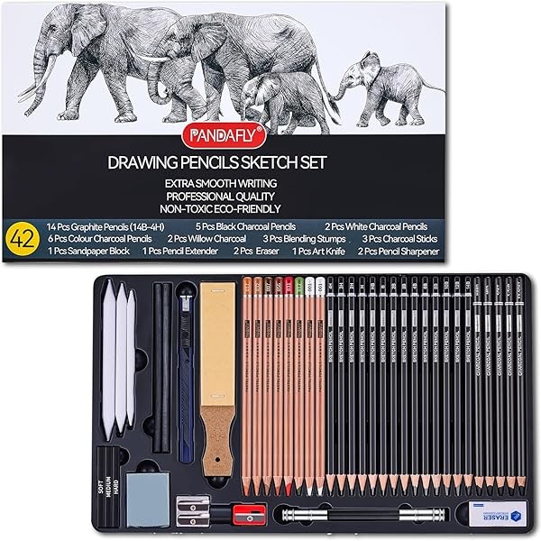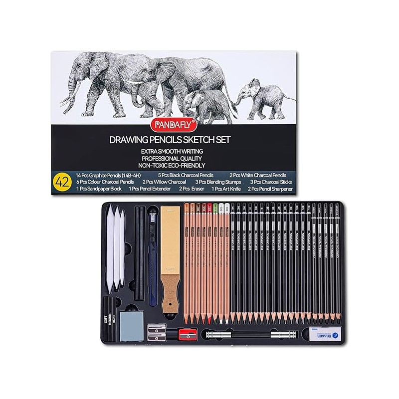 PANDAFLY Drawing Sketching Pencil Set, 42 Pack Pro Art Pencil Kit with Graphite Pencils (14B-4H), Charcoal Pencil, Ideal for Shading, Blending, Drawing Set for Beginners & Pro Artists