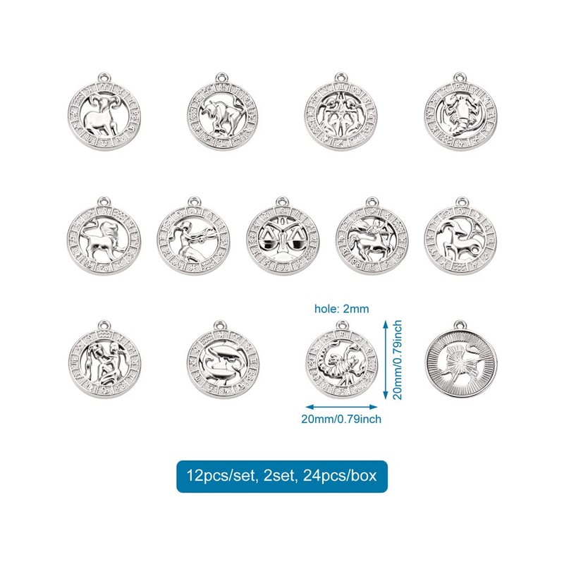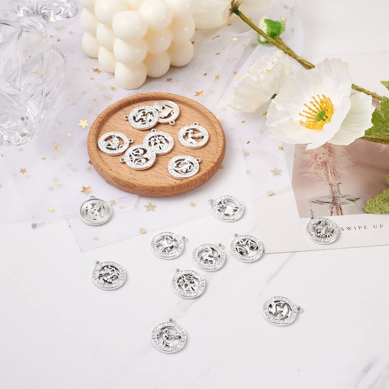 Pandahall 24Pcs Twelve Constellation Zodiac Sign Charms Flat Round Zodiac Graph Sign Hollow Pendants Astrology Alloy Charm Beads for DIY Bracelet Necklace Jewelry Making (Platinum)