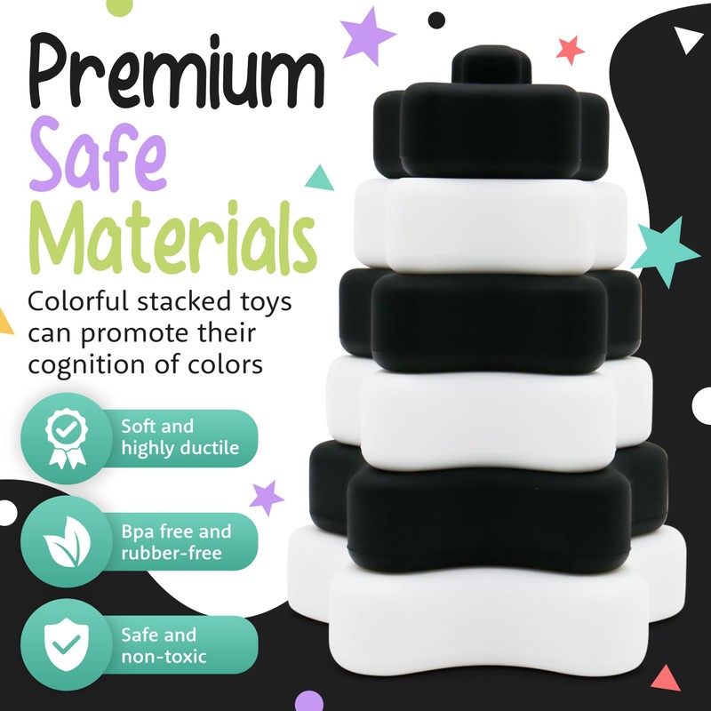 - Durability: Silicone stacking toys are incredibly durable and can withstand rough play, bending, and chewing without losing their shape.