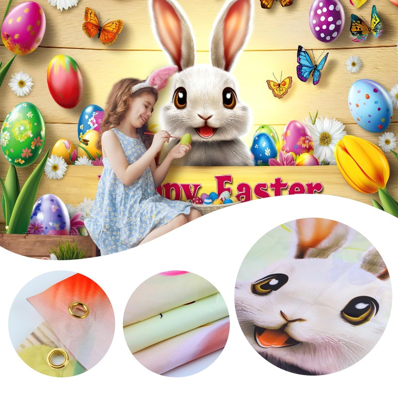 - High quality: Funny Happy Easter background banner made of polyester fabric, durable, digital print, bright colour, high colour fastness. Large Easter background banner that is easy to hang indoors or outdoors, such as door, wall, garden, room, ceiling, fireplace, tablecloth, wallpaper, curtain, photo background, etc.