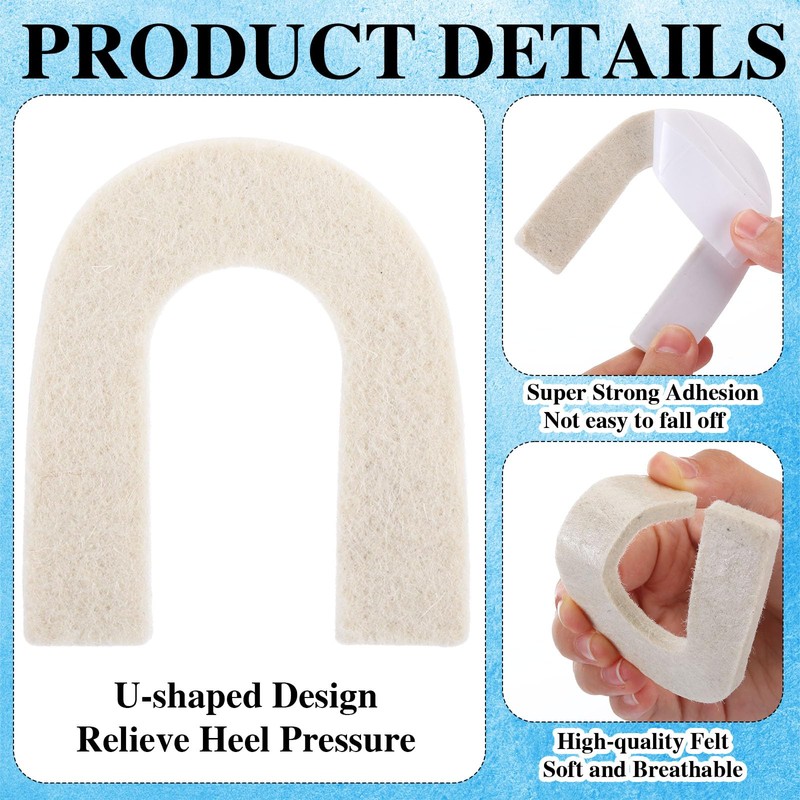 - Horseshoe U-shaped Decompression Design: the arc contour of horseshoe pads for feet accurately fits the heel curve and effectively disperses the pressure on the sole of the foot; Heel wear Pads high-elastic felt absorbs the impact of walking, relieves heel fatigue caused by long-term standing/walking, and improves comfort