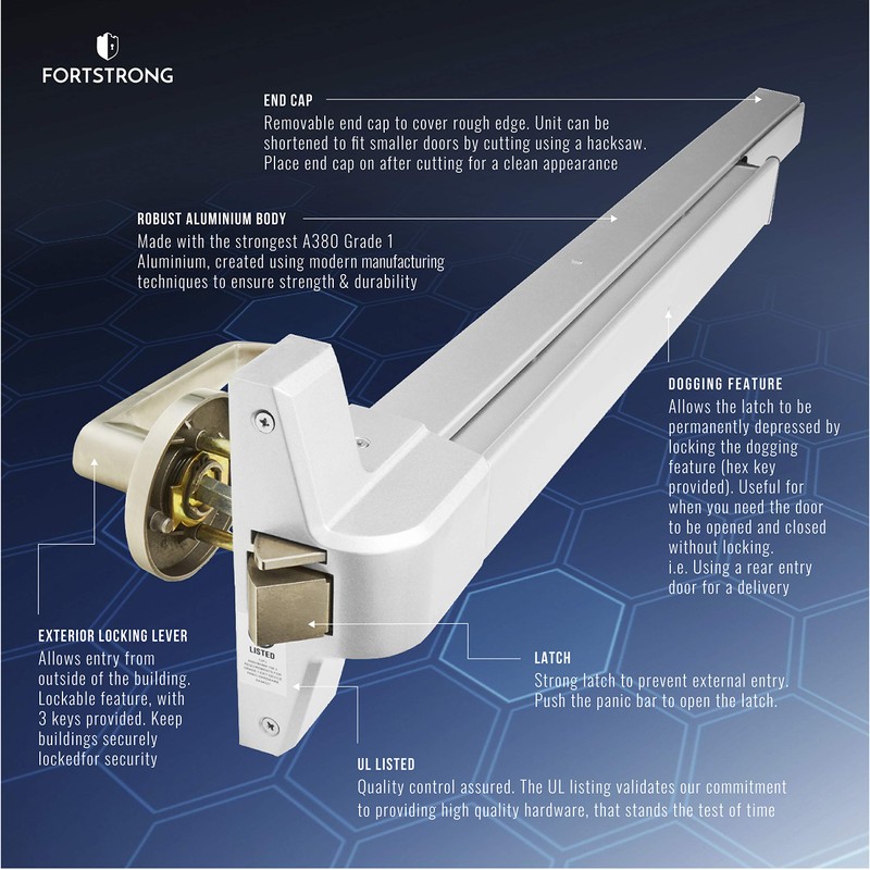 • High-Quality Hardware at a Great Value: Proven to last in over half a million test cycles, Fortstrong’s FS-950 series panic par exit device is grade 1 certified and ADA approved to work in medium to high traffic areas. With our sleek silver finish and reliable hardware, our push bar exit is an incredible product for a great price.