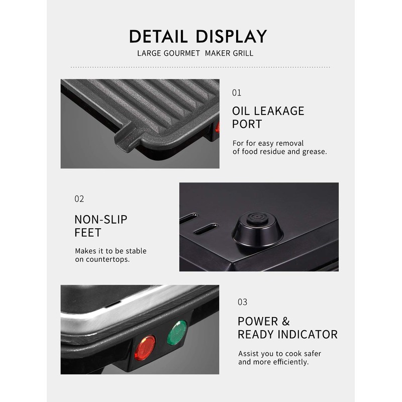 - Large Cooking Surface: The grill features two spacious 11" x 9.8" cooking plates that can hold up to 4-slice sandwiches or 6 medium panini bread at once. The plates can also be flattened 180 degrees, allowing you to grill more food efficiently and cutting your cooking time in half. It's versatile enough to cook burgers, steaks, sandwiches, paninis, vegetables, and more, making it the perfect choice for all your indoor grilling needs.