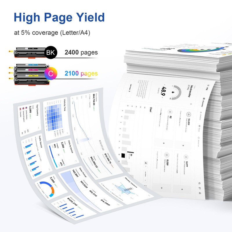 • High Page Yield: 2,400 pages per black 414A toner cartridge & 2,100 pages per color 414A toner cartridges (Letter/A4, at 5% coverage)