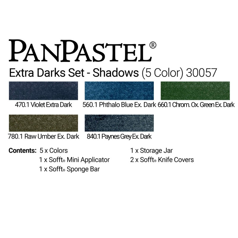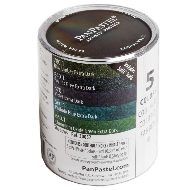 PanPastel Colors are genuine artists' quality pastels, uniquely packaged in a pan, allowing the artist to lift, blend, layer, control and apply pastel colour just like paint! Shadows Colours included in this set: - Raw Umber Extra Dark - 780.1 - Payne's Grey Extra Dark - 840.1 - Violet Extra Dark - 470.1 - Phthalo Blue Extra Dark - 560.1 - Chromium Oxide Green Extra Dark - 660.1 This set of 5 Shades are made with highest quality pigments, have excellent lightfastness and are so soft you cannot hold them.With this set you will receive:Sofft Tools,Storage Jar.Each pan contains 35% more material than the average stick*. *Based on a market survey of soft pastel sticks (Standard size)