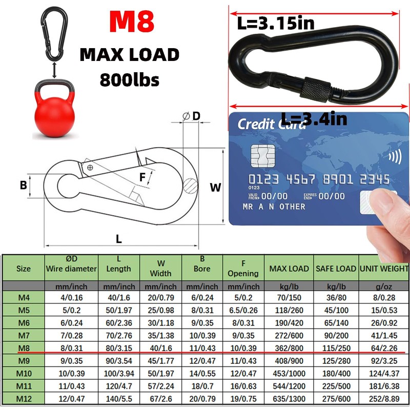 • 【PRODUCT PARAMETER】:M8 black locking snap hook steel Wire diameter 7.8mm/0.31 inches, length 80MM/3.15 inches, width 40MM/1.57 inches. The breaking force is 800 pounds, and the safe bearing capacity should not exceed 250 pounds according to different use scenarios.
