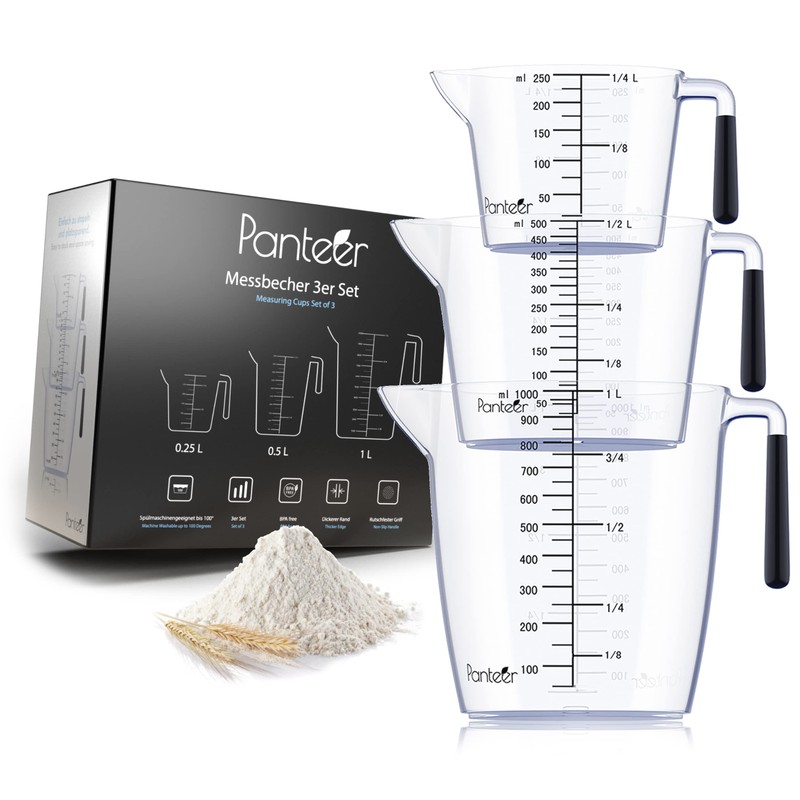 Panteer ® Measuring Cups Set of 3 - Heat Resistant and Dishwasher Safe up to 100 Degrees - 1L, 500ml, 250ml - Ideal as Kitchen Aid and Baking Accessories - BPA Free