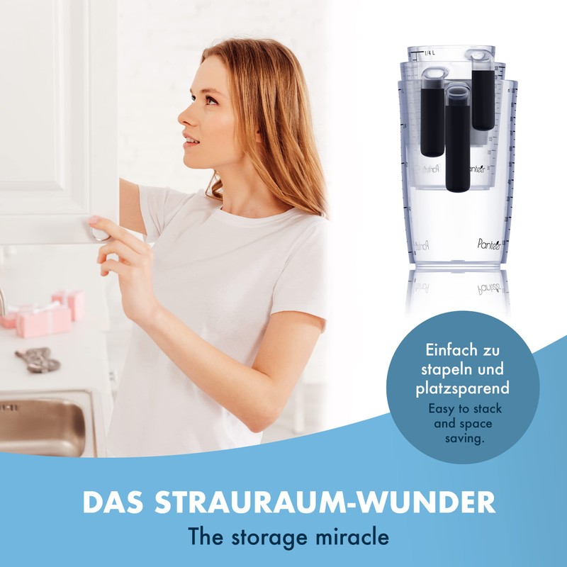 - Stays strong – unlike glass measuring cups, the Panteer measuring cups are made of plastic and are therefore much more robust. Although we would not recommend dropping them all the time, they will still withstand falls.