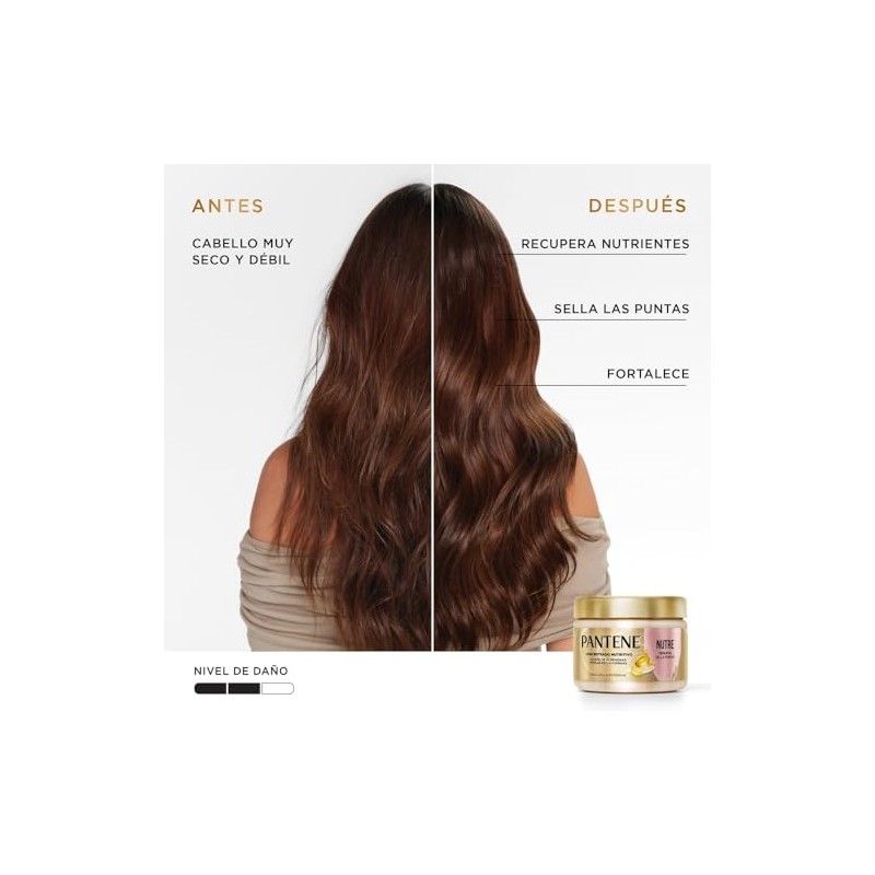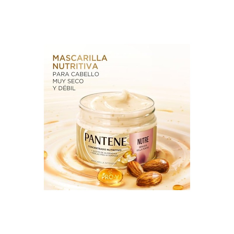"¿Tu cabello necesita nutrición intensa. Encuentra tu match perfecto con las nuevas Mascarillas Concentradas multibeneficios de Pantene: la poderosa mezcla concentrada de aceites naturales y Perlas Pro-Vitaminas se disuelve creando una infusión nutritiva que nutre profundamente desde el interior. ¡No más intentos fallidos. La mascarilla nutritiva para el cabello, contiene más de 5000 Perlas Pro-Vitaminas solubles y Aceite de almendras para el cabello. Las Perlas Pro-Vitaminas están llenas de nutrientes que se disuelven profundamente en las hebras capilares, para dejar el cabello fuerte, suave y brillante desde el primer uso. Es ideal para cabello seco, nutriendo profundamente, renovando y sellando las puntas abiertas. Disfruta su textura cremosa y deliciosa fragancia, que dejarán tu cabello reparado y con aroma irresistible. Recomendada para todo tipo de cabello, 'sin sal ni aceites minerales. ¡Úsala como tu cabello más la necesite.