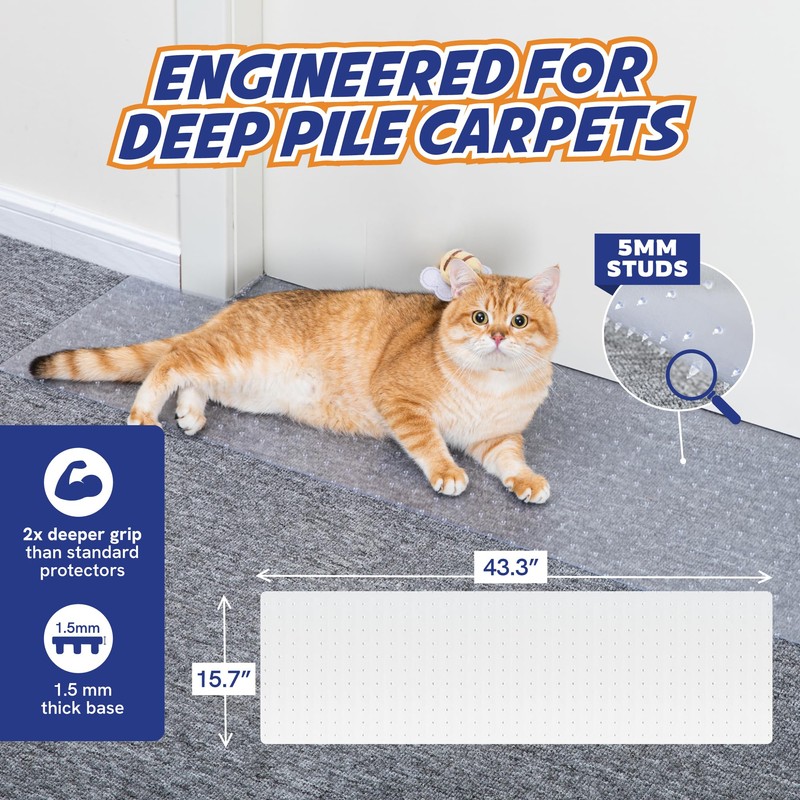 - CARPET SCRATCH STOPPER THAT WORKS — Our heavy-duty cat carpet protector features 5mm studs specifically designed to grip thick carpets securely. Unlike standard carpet scratch stoppers, these deeper anchors ensure your doorway carpet stays protected even against the most determined scratchers.
