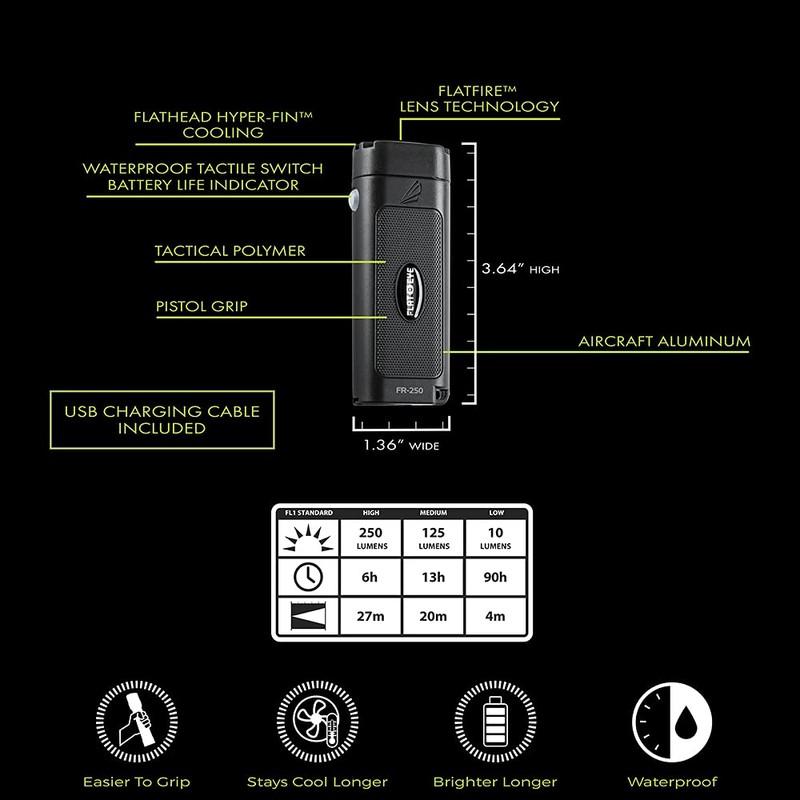 Panther Vision FLATEYE LED Rechargeable FR-250 High Performance UNROUND Flashlight Multi Position Waterproof & Shockproof - 250 Lumens (FR-8049), Black
