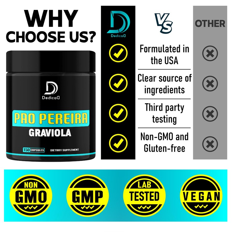 DEDICAD Pao Pereira Bark Extract and Graviola Soursop - 150 Capsules Supply - Advanced Formula for Immune System, Comfortable Mind, Body Management & Strength