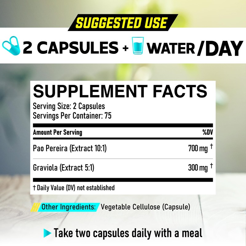 - 💚 Simple Use: 1 Pack with 150 Pills for 75 Servings - Consume 2 Pao Pereira capsules daily, a gluten-free, non-GMO, veggie capsule; for busy people to maintain daily joy.