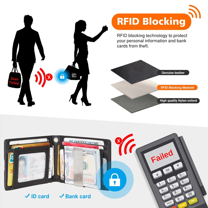 - 🔒RFID BLOCKING — Equipped with advanced RFID SECURE technology, made of a unique metal composite, engineered specifically to block 13.56 MHz and above RFID signals, protect your information from unauthorized scans.