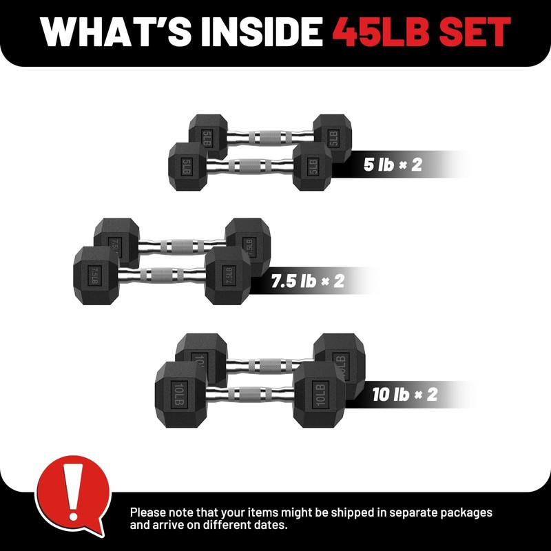- 45 lb Dumbbells Set: Includes a pair of 5 pound, 7.5 pound, 10 pound rubber hex dumbbells, delivering lasting durability for strength training and exercise.
