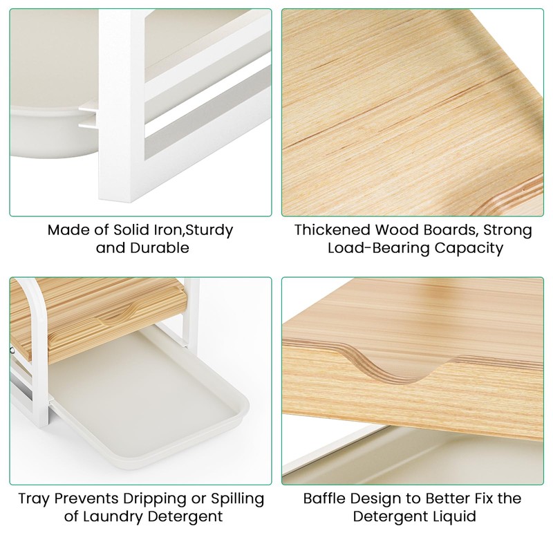 - Laundry Detergent Stand: Made of high-quality wood and iron frame, which is sturdy has a strong load-bearing capacity and can hold two bottles of liquid laundry detergent simultaneously