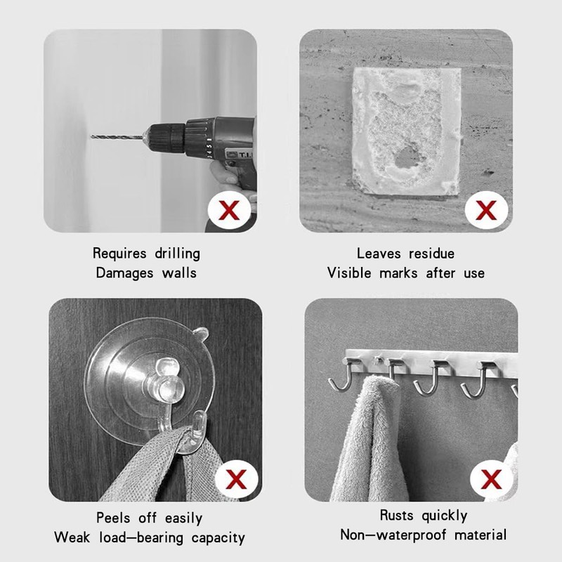 - EASY USE & QUICK INSTALLATION - No drilling, no screws, no nails and no glue, the utility wall hooks only just you peel off the cover starting from the bulge, then put the hooks on smooth surface like tile, glass, metal, wooden door, stainless steel.