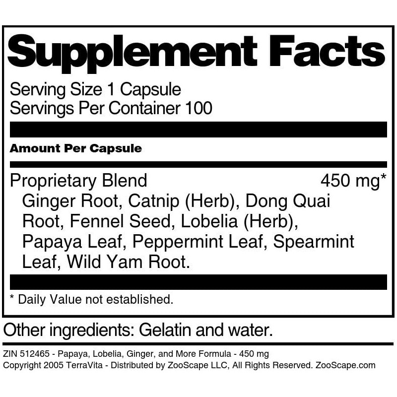 - Papaya, Lobelia, Ginger, and More Formula - 450 mg (100 capsules, ZIN: 512465)
