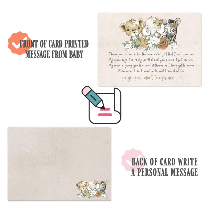 - Pre-printed Jungle Baby Shower Theme: Each card features a pre-printed message from the baby on the front with a blank back for guests to write their own personalized message of thanks.
