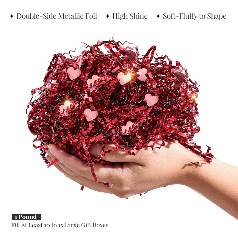 - GLITZ & GLIMMER NEST FOR YOUR GIFTS - Dazzling and Generous Quality of 1 LB Valentine-Themed Gift Wrapping Fillers. Large enough to fill at least 10-15 large gift boxes or gift bags. This Tissue Strands Shred is a versatile party favor supply for occasions like Birthday, Anniversary, Weddings, Mother's Day, Valentines' Day, Christmas, Thanksgiving, and Housewarming Gifts. Many small business owners use this product to impress customers and elevate retail merchandise presentation.