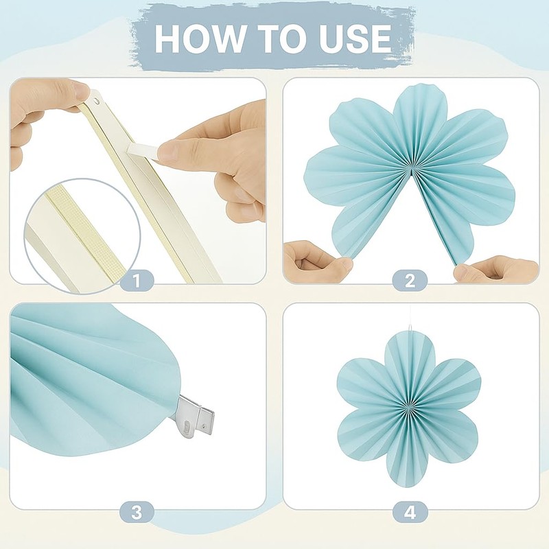 - 3. Effortless Setup and Hanging Flexibility: Featuring an intuitive folding design with pre-attached hanging strings and self-adhesive stickers, these paper flowers allow for quick installation on walls, ceilings, or doorways. Whether it’s a spontaneous party or a well-planned event, these hanging paper decorations bring beauty and ease: no tools, no fuss—just unfold, stick, and decorate.