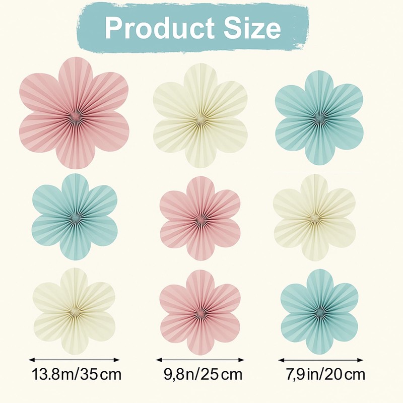 - 1. All-in-One Floral Fan Set for Party Décor: This versatile pack includes 9 paper flower fans in assorted sizes—3 pieces each in 12.2", 10", and 7.9"—offering vibrant variety for any setting. Designed to elevate your space with vivid colours and layered textures, these paper fans are ideal for birthday celebrations, weddings, baptisms, or seasonal home decorating: a complete décor solution that turns any event into a visual delight.