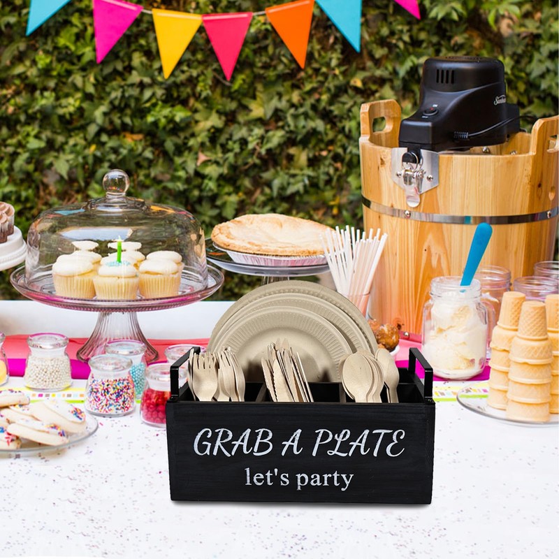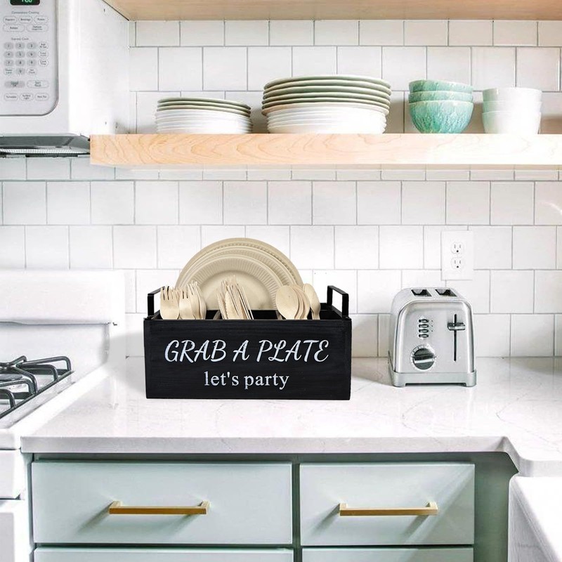 - ✨ Paper Plate Holder - 4 separate compartments for organizing and storing kitchen utensils such as paper cups, bamboo spoons, forks, knives, disposable plates, napkins, and more.