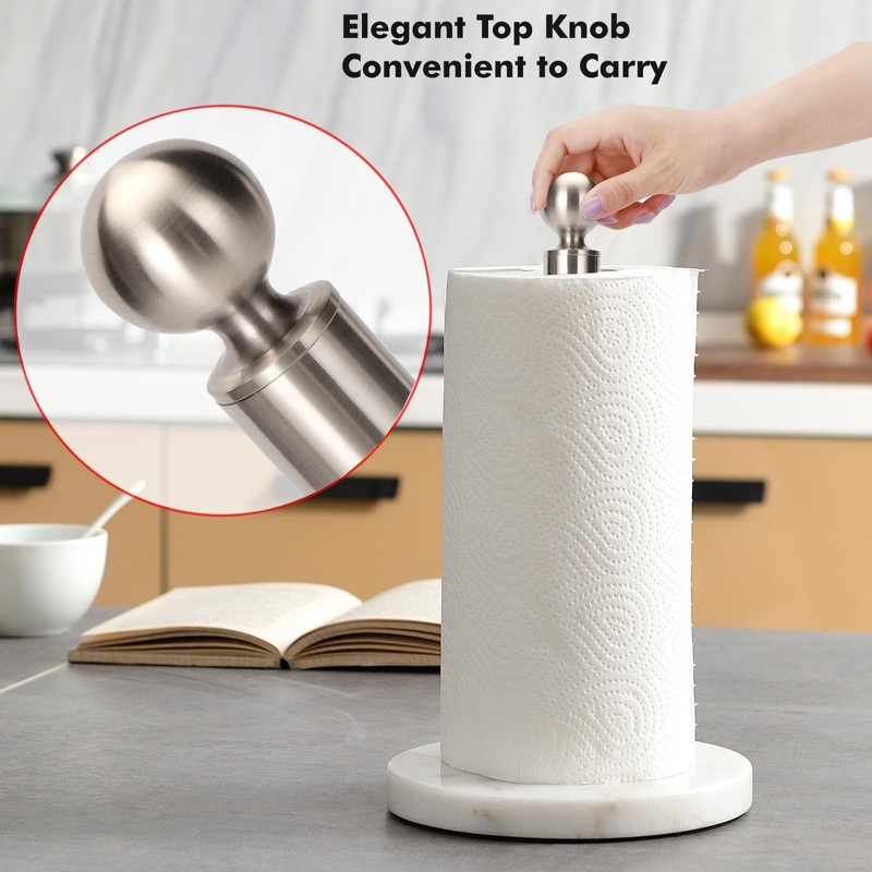 Paper Towel Holder Countertop, Standing Paper Towel Roll Holder for Kitchen Bathroom, with Weighted Base for One-Handed Operation (Marble Base, Brushed Nickel)