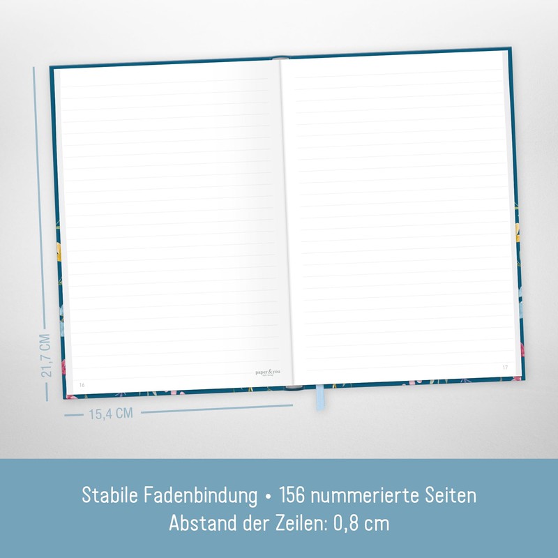 - Lined notebook – from Häfft-Verlag, slightly larger than A5 (15.4 x 21.7 cm), with practical elastic band for closing and ribbon page marking. Book for notes of all kinds, goals, sketches, agenda, plans and thoughts!