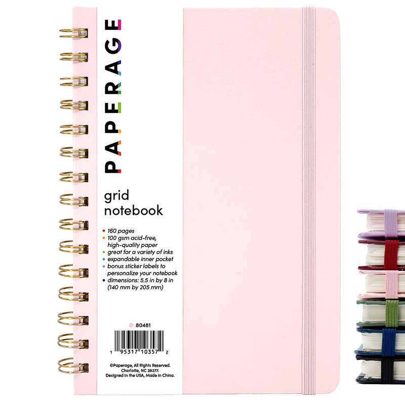 - HARDCOVER SPIRAL JOURNAL: This medium 5.5 in by 8 in graph paper spiral notebook features durable and water-resistant vegan leather cover, rounded corners, 160 pages, inner expandable pocket, sticker labels, ribbon bookmark & elastic closure band.