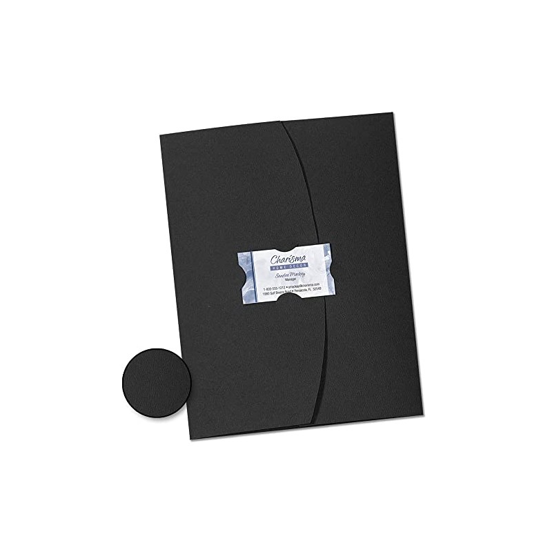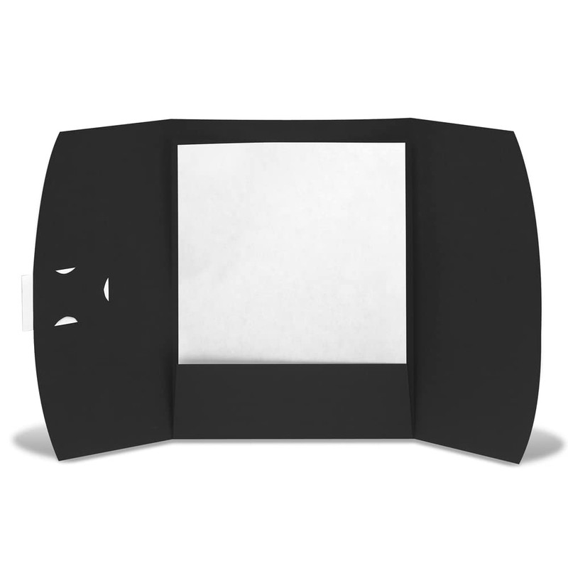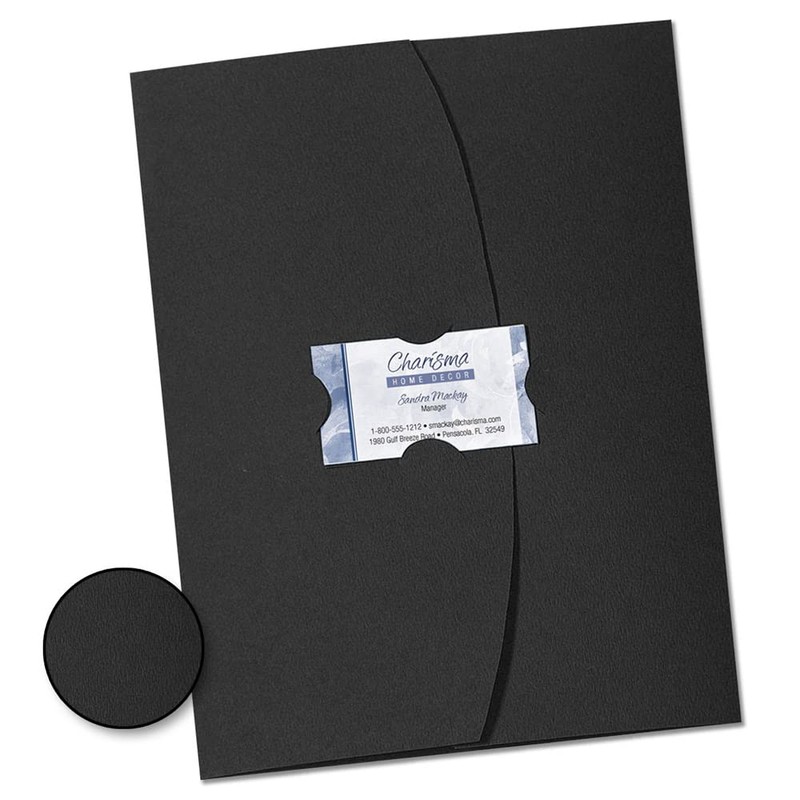 Create an impressive display for your next business presentation, board meeting, school orientation, or clinic information with Black Crescent Presentation Folders (aka Foldieres). These aren't your typical presentation folders--they come with crescent-shaped flaps for a stylish finished product. Each folder includes a die-cut portion for a business card and one inside pocket to keep papers, forms, brochures, and more nicely organized at home, the office, or in the classroom. Using these special Black Crescent Presentation Folders for your next report, convention, trade show, or event will really make your information stand out from the crowd. These 9" x 12" (closed) black folders come in a set of 10 and are made of sturdy 80lb stock, so your important papers will be nicely protected.