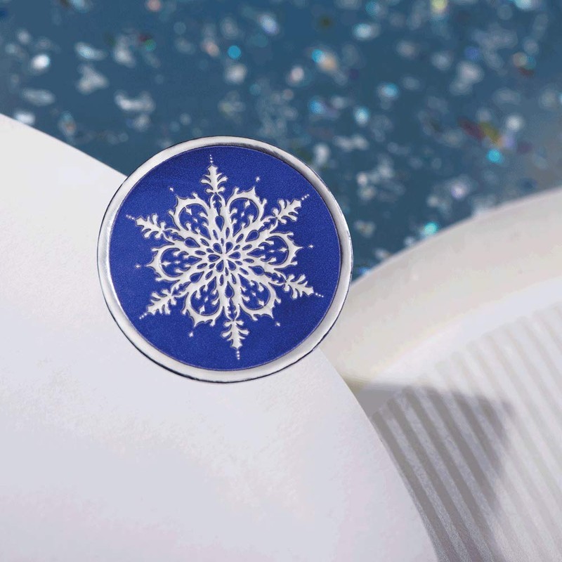 - Embossed seals feature a smooth, solid foil edge and snowflake design on a bright foil background