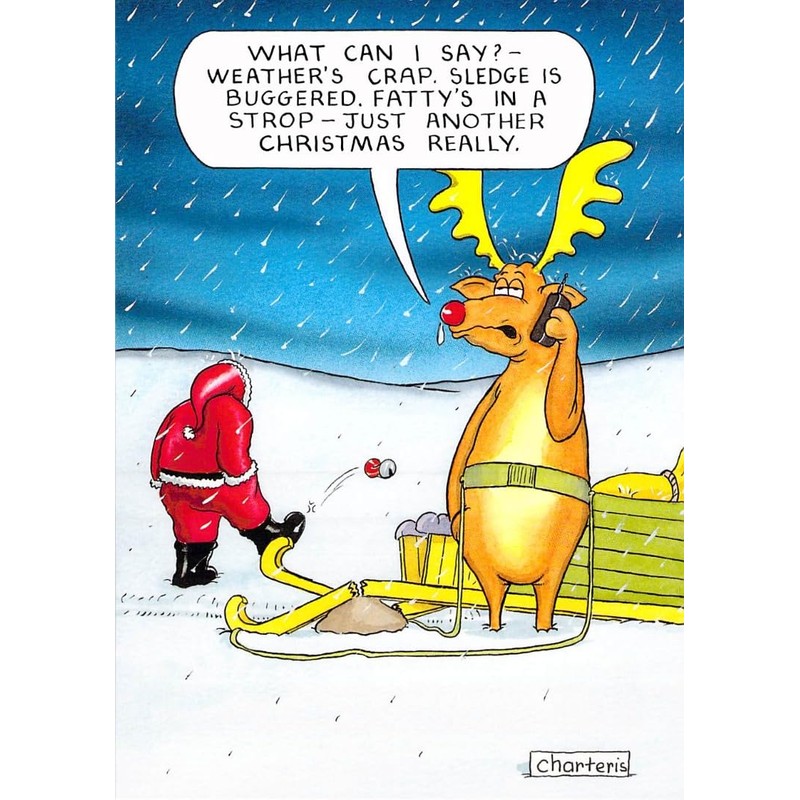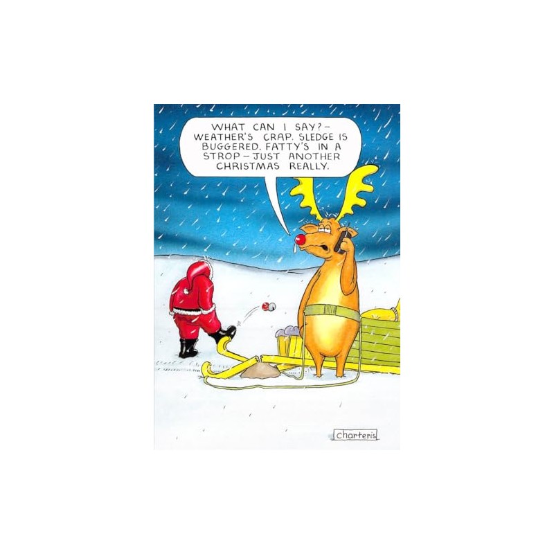 - The Caption on the Front Reads: 'What can I say? - weathers crap, sledge is buggered, fatty's in a strop - just another Christmas really.'