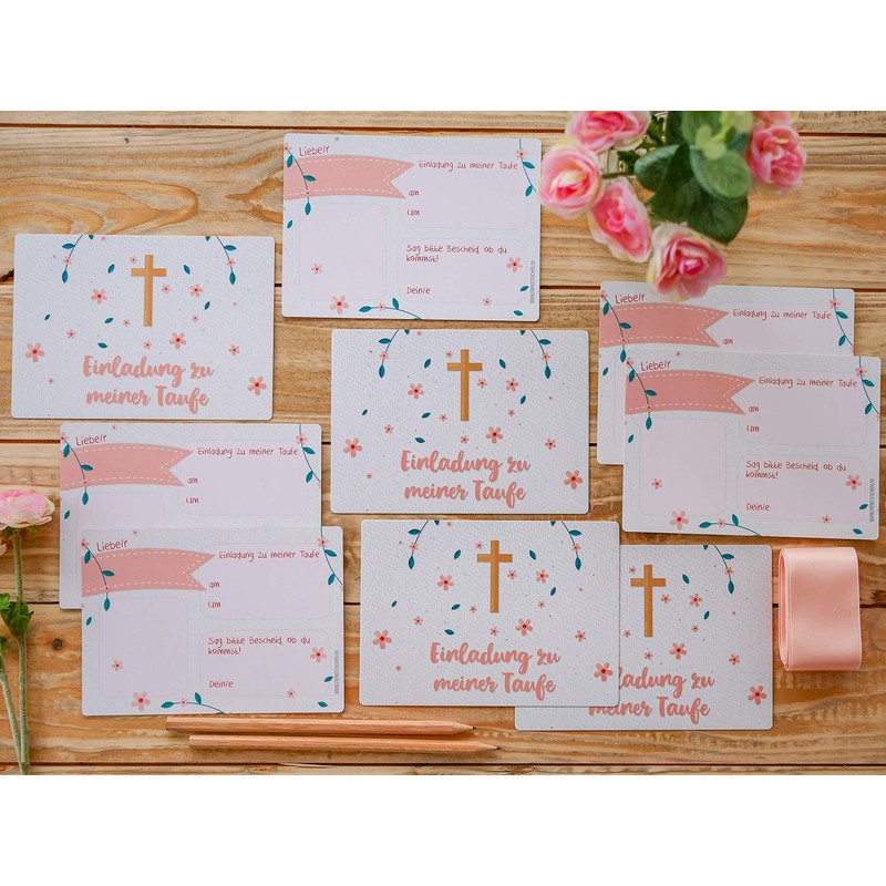 • 12 cute invitation cards for christening - cross and flowers motif - DIN A6 (300 g/m² cardboard paper - made in Germany).