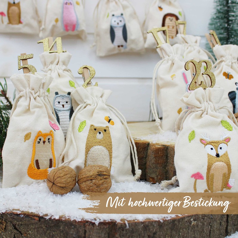 Papierdrachen 24 Advent Calendar Fabric Bags for Filling - with Gold Wooden Numbers - Fabric Bags to Decorate Yourself - Gift Bags - Forest Animals Embroidered Set No. 27