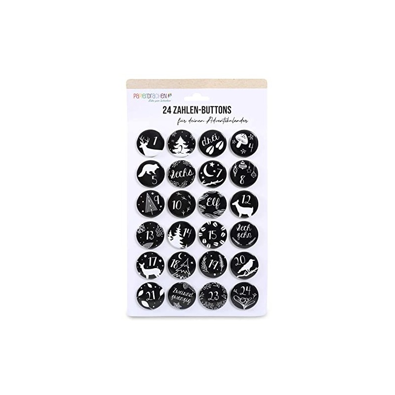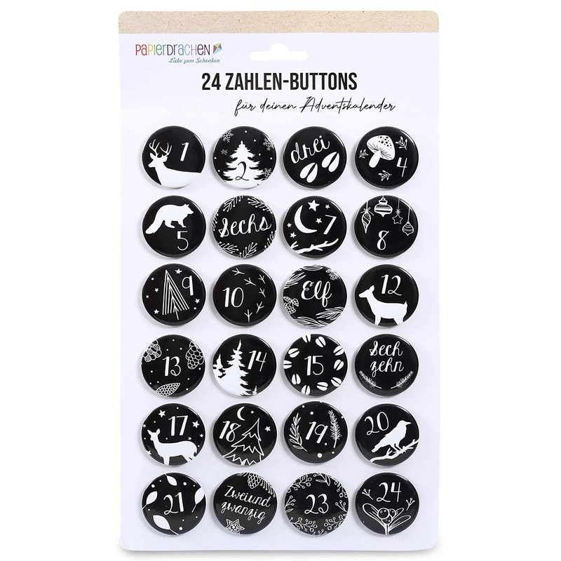 Papierdrachen 24 Advent Calendar Number Buttons 35 mm – Lapel Pins for Decorating Advent Calendars – with Numbers from 1-24 – Black and White – Ideal for Fabric Bags, Bags and Bags