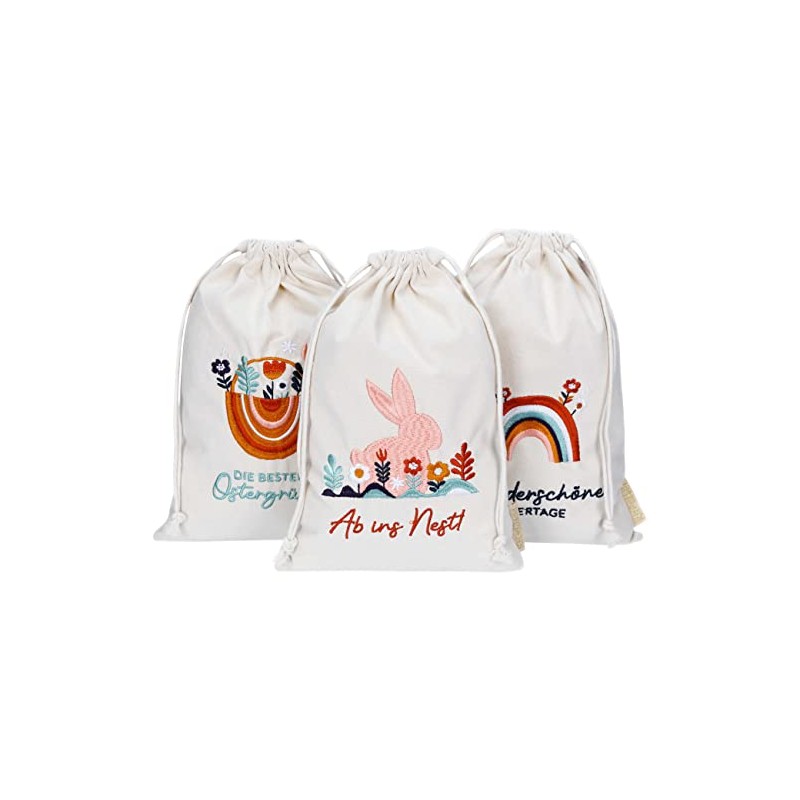 Papierdrachen 3 Linen Bags with Embroidery - Easter Packaging Gift Packaging Table Decoration - Fabric Bags for Easter - Boho - 20 x 30 cm - Set of 5