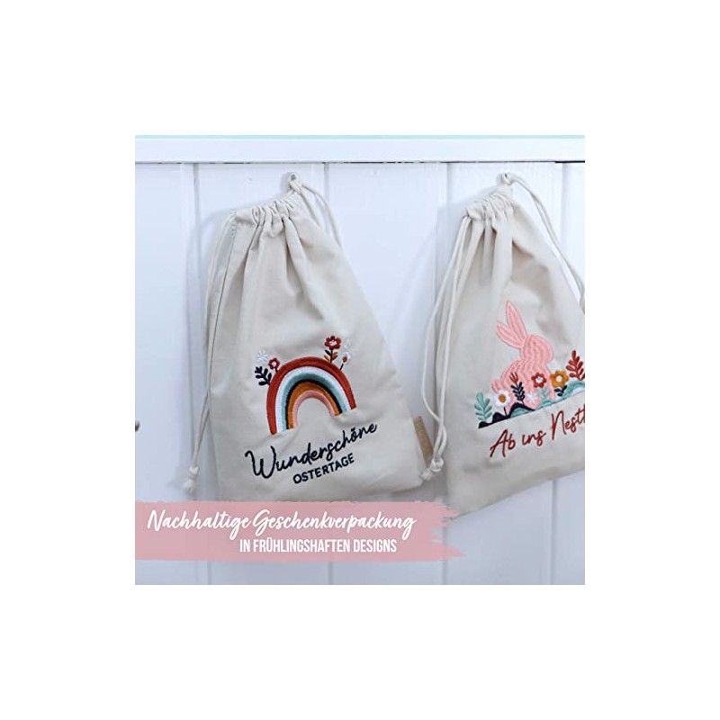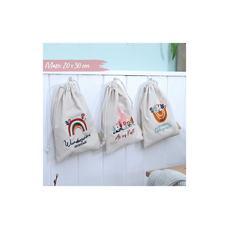 Wrapping Easter gifts can be tedious and exhausting, especially when there are many - with our packaging set, it does not have to be that. The bags are embroidered in high quality and only need to be filled and sealed. The timeless design is suitable for all age groups. Fill them with treats and small gifts, then the gift bags are closed with the help of the drawstring - done. For wrapping your Easter gifts, you do not need scissors or glue this year. Our complete set contains everything you need.