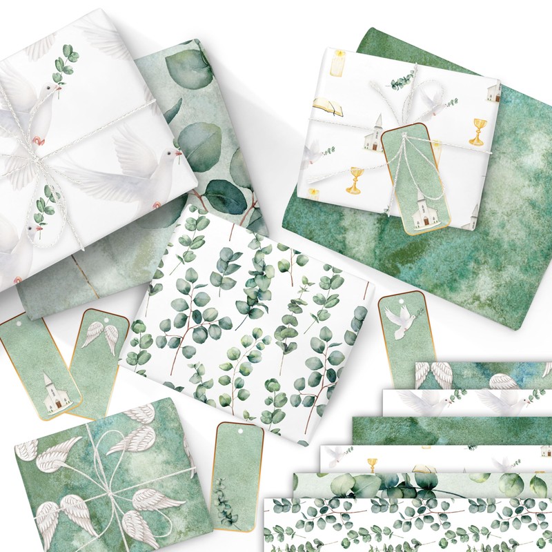 Papierdrachen 6 Sheets of Wrapping Paper | 60 x 40 cm - 6 Different Designs High Quality on 80 g/m² Paper - Eucalyptus - Gift Packaging for Christening, Communion, Confirmation - with 12 Labels - Set