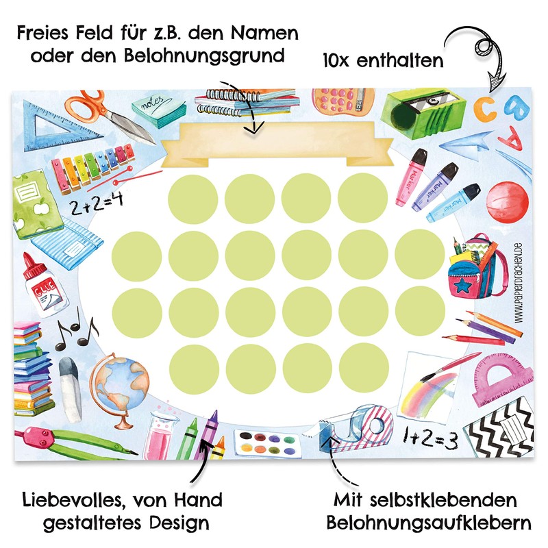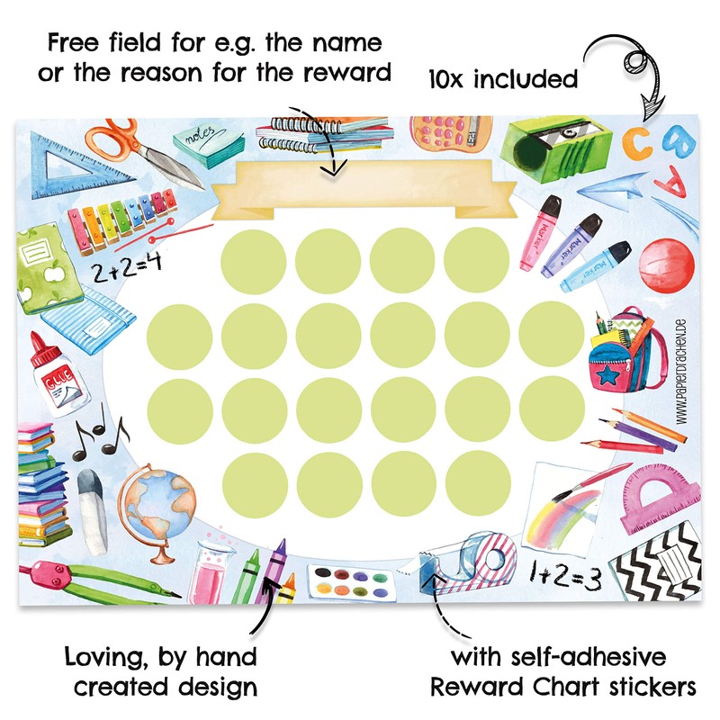 - 1 reward board pad (DIN A4 with 10 pages) - school motif.