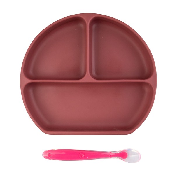 PAPU BABY Plato con divisiones y cuchara de silicón para bebés. Libres de BPA. Plato con succión. Silicón de grado alimenticio. Alimentación independiente. (Magenta)