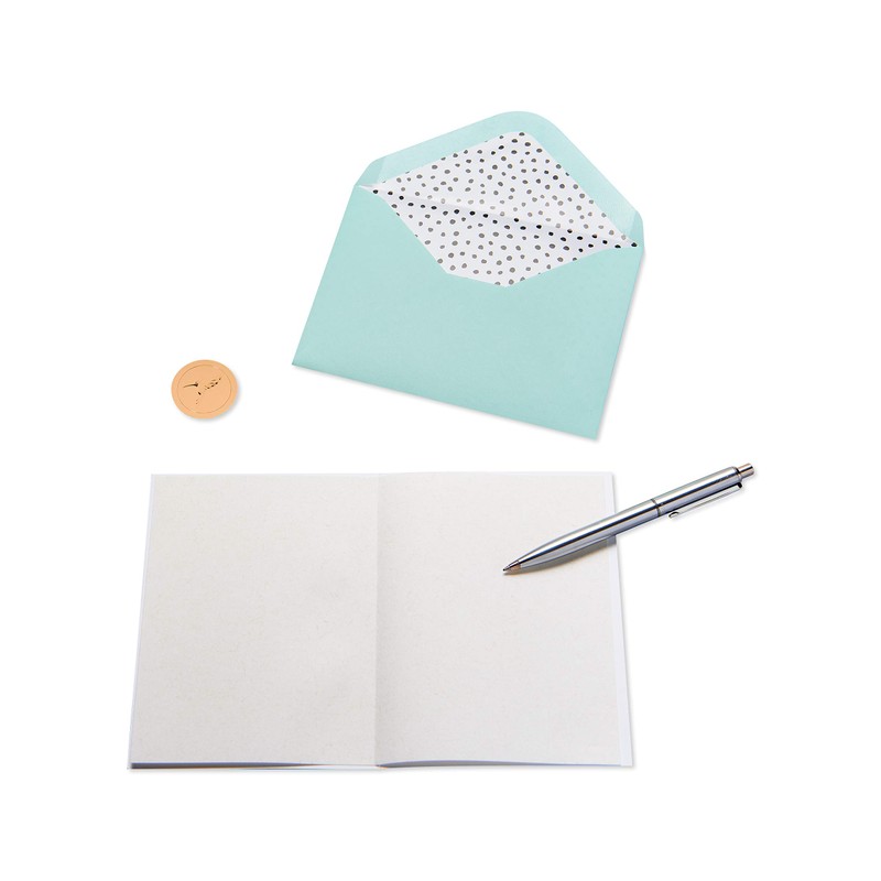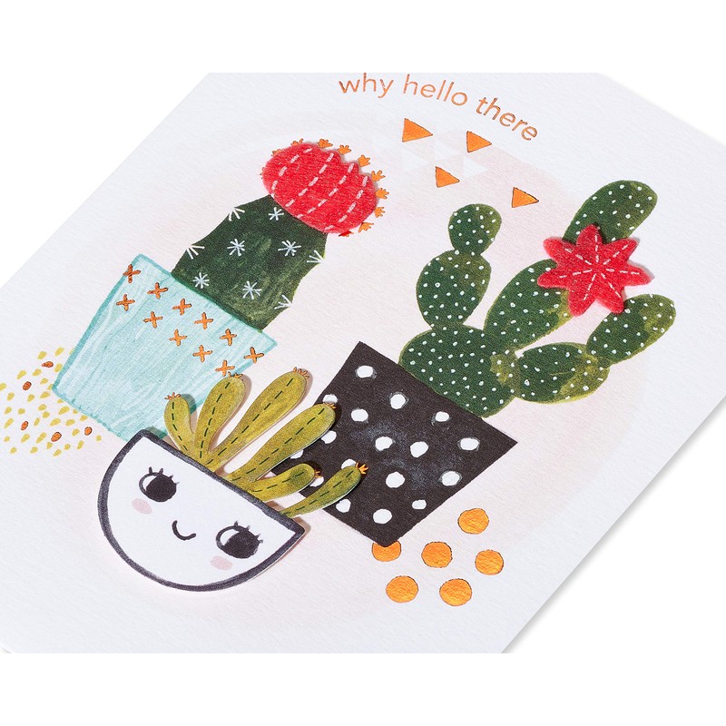 You don’t have to be crazy for cacti (but it totally helps) to enjoy this whimsical Papyrus Friendship card. With embellishments that include foil, felt, and layered paper attachments, this is a cute and colorful cactus trio that can be touched without pricking your finger. The inside of the card is blank so you can add your own personal message. The card comes with a soft green envelope with a white lining featuring a fun pattern of black dots scattered throughout. The unique Papyrus gold seal is included.