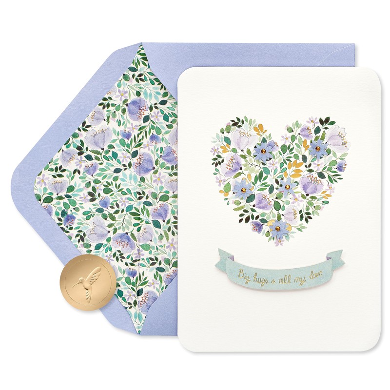 - This premium Thinking of You card from Papyrus features a beautiful floral illustration shaped like a heart, embellished with thoughtful details like shimmering metallic foil, gems, layered paper attachments, and rounded corners