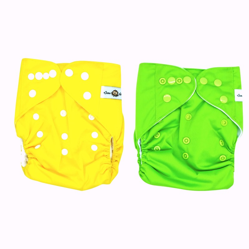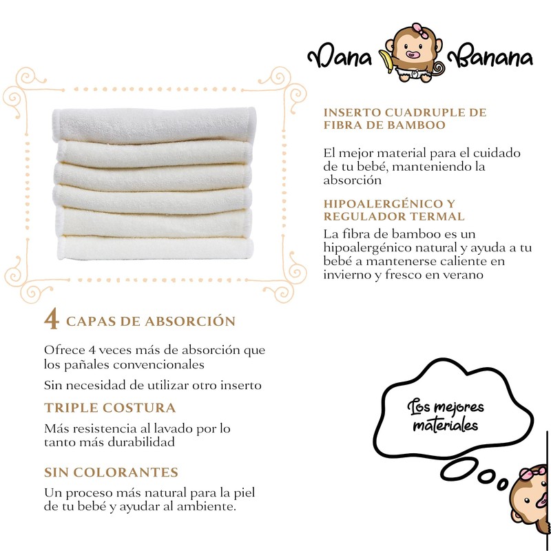 - 🙈 ¿QUÉ INCLUYE ESTE PAQUETE? – DANA BANANA ofrece en este paquete: 2 pañales lisos, 2 pañales estampados, 4 insertos de 4 capas de fibra de bambú neutralizante de olores y con propiedades hipoalergénicas y antibacteriales