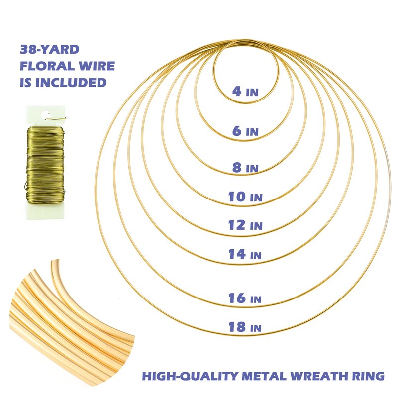 - Juego de 8 piezas: el paquete viene con 8 aros de metal para manualidades y alambre de paleta de 38 yardas. Gran combinación para tus manualidades de corona de aro floral.