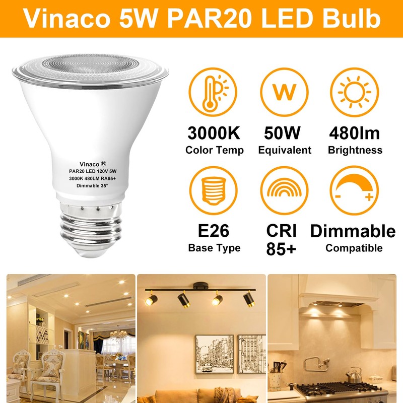 【EASY INSTALLATION】: Featuring a standard e26 par20 led bulb base, installation is quick and straightforward. These par20 led bulbs provide 480 lumens of bright light at full brightness, with a 35-degree narrow spot beam angle. Whether you're installing them in recessed lighting, track lighting, or a range hood light, these bulbs will fit effortlessly into your fixtures. The e26 par20 led bulb 3000k color temperature creates a cozy atmosphere for your space.