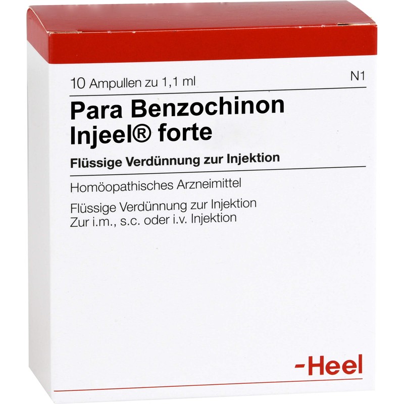 Para-Benzochinon-Injeel forte, Flüssige Verdünnung zur Injektion. Anwendungsgebiete: Registriertes homöopathisches Arzneimittel, daher ohne Angabe einer therapeutischen Indikation.