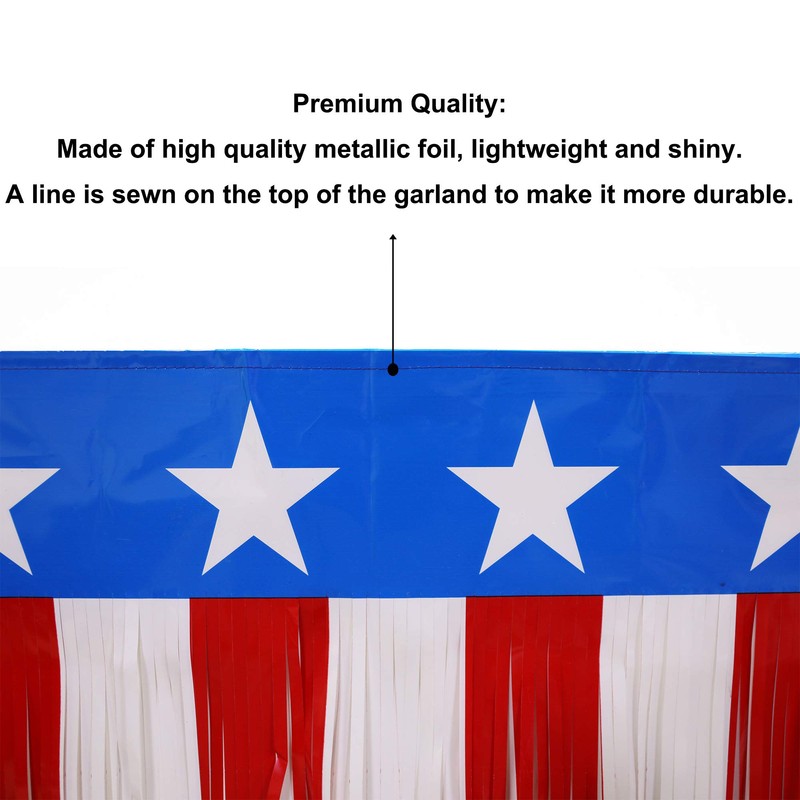 * Product: Metallic Fringe Garland * Conditions: brand new * Color: American Flag Stripes and Stars * Metallic look / Tinsel Metallic Foil fringe Garland * Size: Each garland is 15" high x 10 foot long rolls * Package Includes: Come with 5 Pack foil skirting . ** Give your event some extra pizzazz with this Metallic Fringe Garland!**