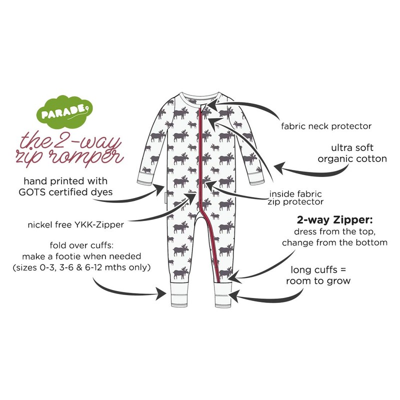 Parade's organic cotton '2-way' zipper rompers are designed for ultimate comfort and easier changes. Double zippers allow for quick changes and cuddly comfort - zip down from the top for dressing, zip up from the bottom for changes.
